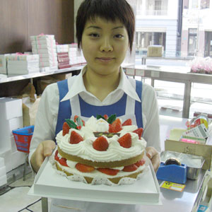 これは特注のショートケーキです。かなり大きくて1台で40人以上食べられます。イチゴはなかに2段サンドしてあります。1台、20000円です。