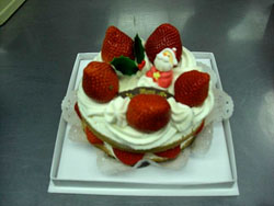 そして、このショートケーキは昨年クリスマスのときいくらでもいいから最高のものを作れと言うご注文で20台作りました。このイチゴは「あまおう」のデラックス、サンドは3Lを使いました。桐の箱に入っているようなイチゴです。