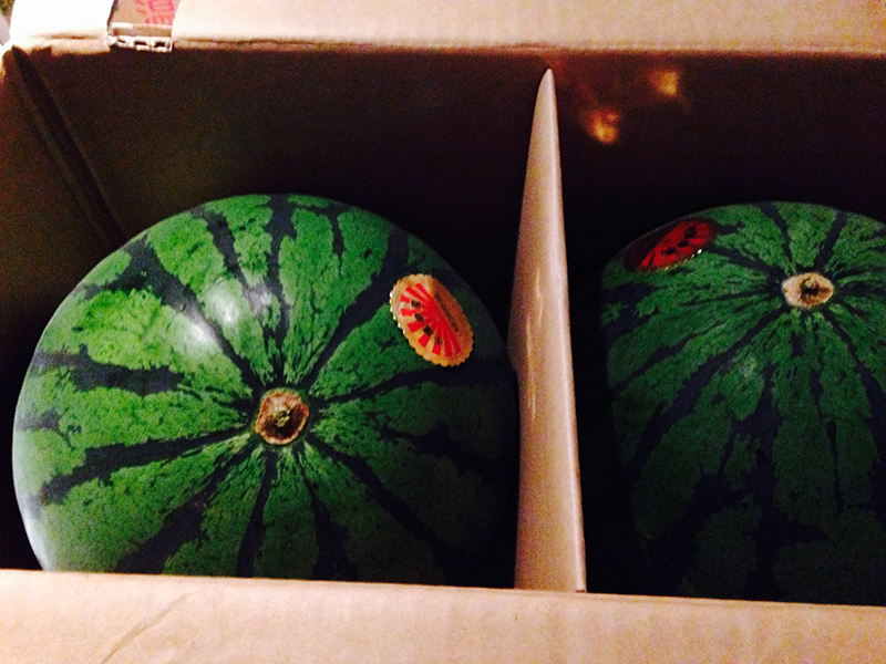 右はメキシコ産のハネジュウメロン。中味は青色と赤いのがあるけれど赤い方が少し高いけれどウマイ。