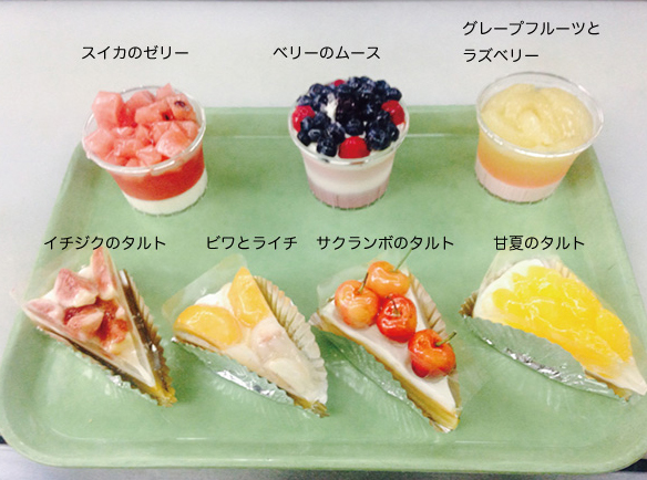 右上はフランボワーズのムースの上にデコポンのゼリーを流してみました。カラフルな春を感じさせるもの、色も天然色です。上にデコポンをのせて出す予定です。