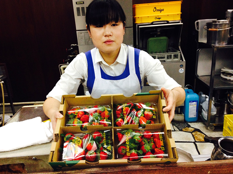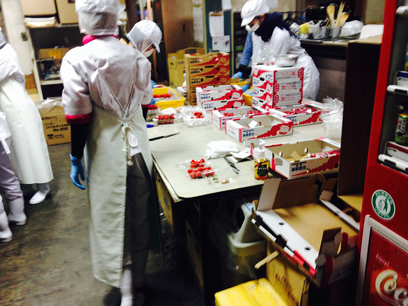 この時期、サンドのイチゴでもまるごとたっぷりと入れます。イチゴの値段を考えるとゾッとするが、これだけは毎年変えないでガンバってます。