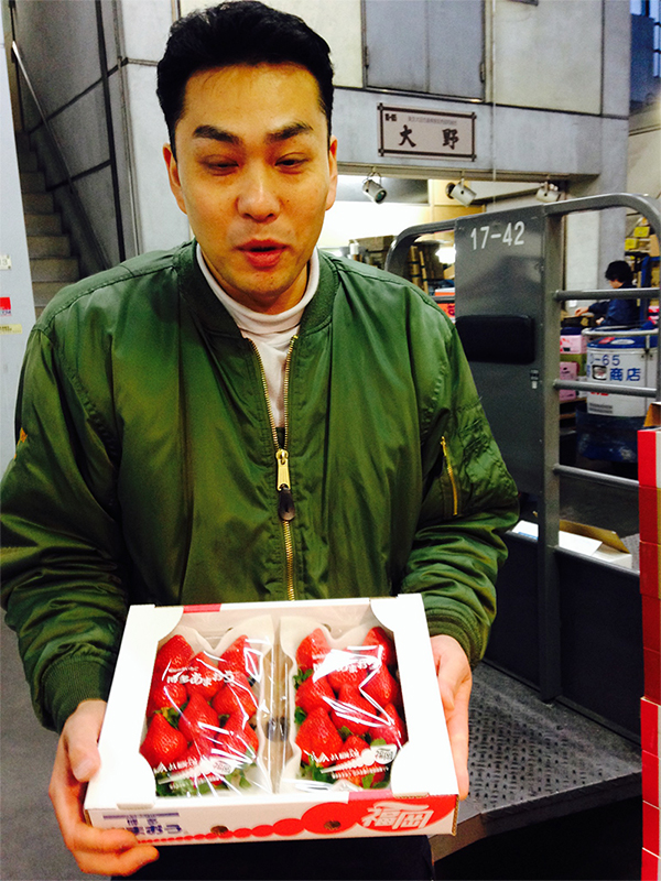 正月苺、大田市場、イチゴ屋さん、若い衆が大勢で出てきている。社長、新年早々新しい物を出したいと言っている。