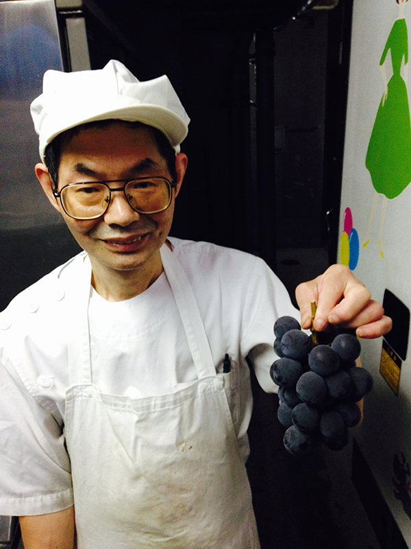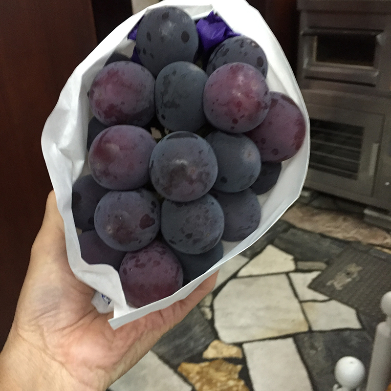 ”雨値段?”だと言っている。普段はあまりに高いので使わなかったけれど、安くすると言ってきた。ナガノパープル、ピオーネ、どちらも最高のもの。デパートで値段をみていただきたいです。