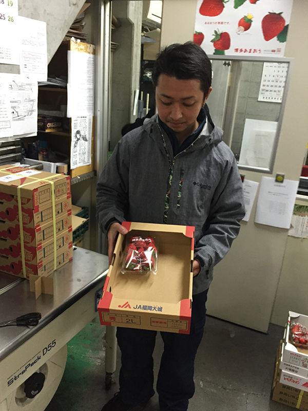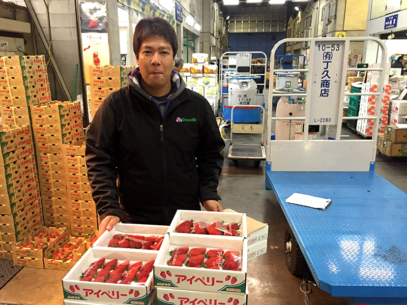 大田市場のイチゴの仲卸の社長、アメリカイチゴの選別をしている。