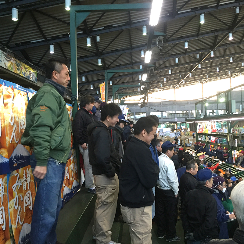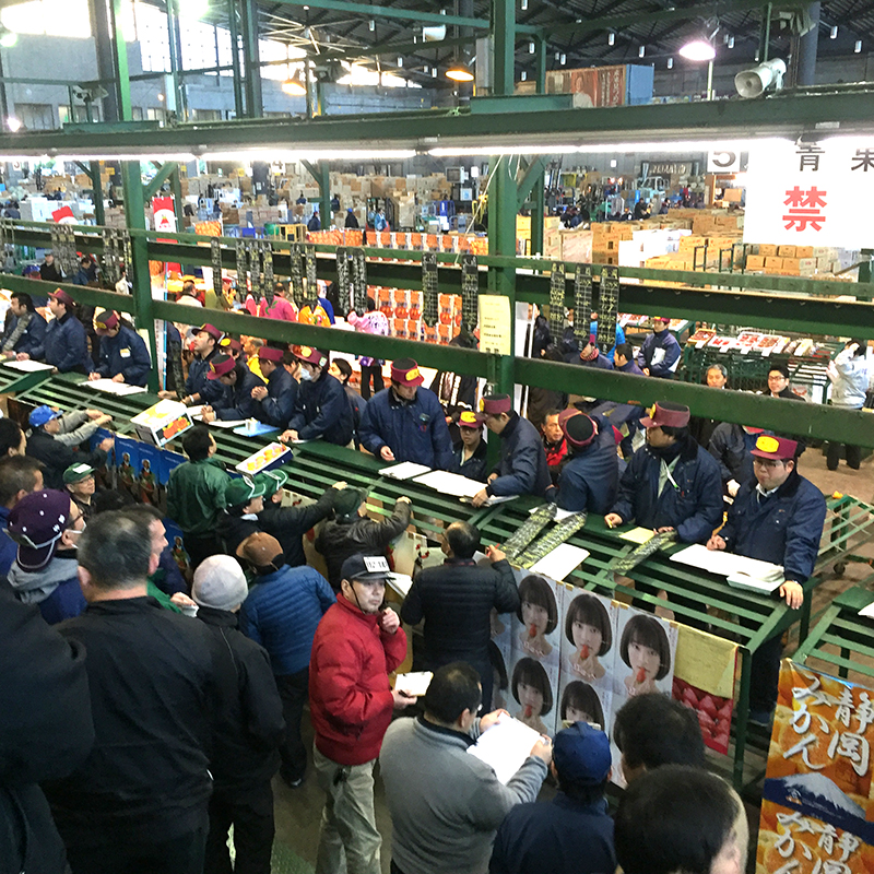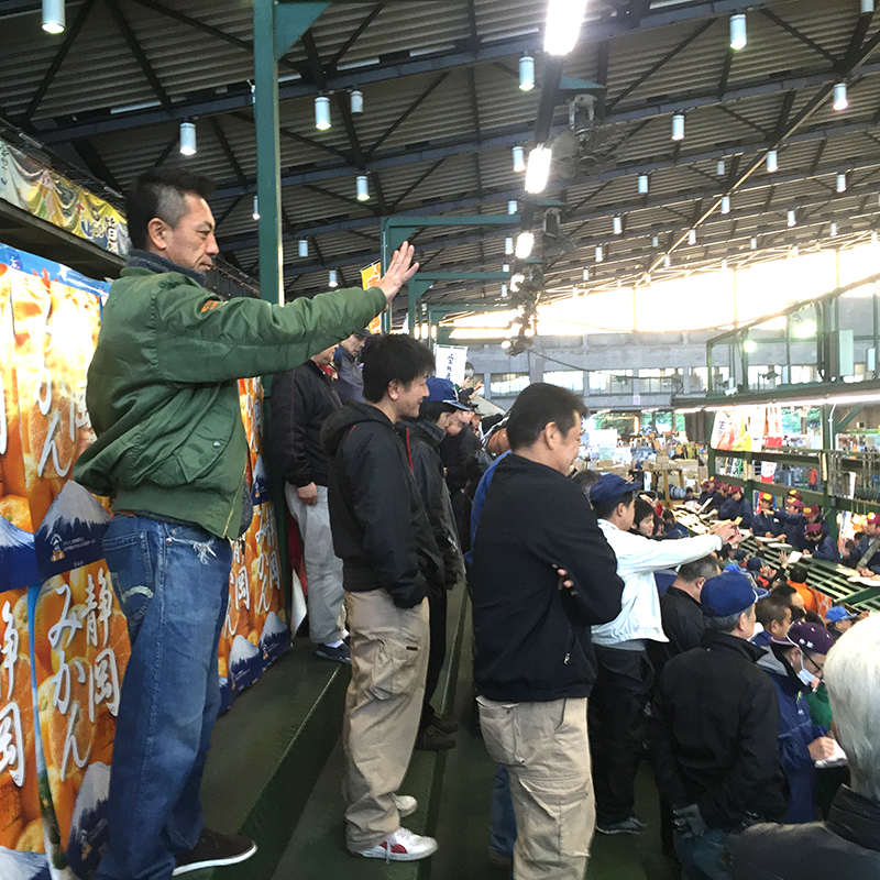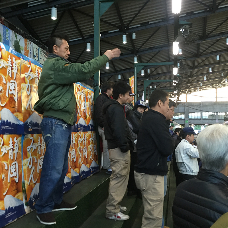 市場で、イチゴのセリ場。イチゴ屋の社長と番頭のケンチャン。この手の上げ方で値段と量を買っていく。
