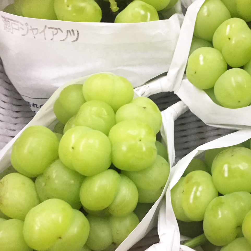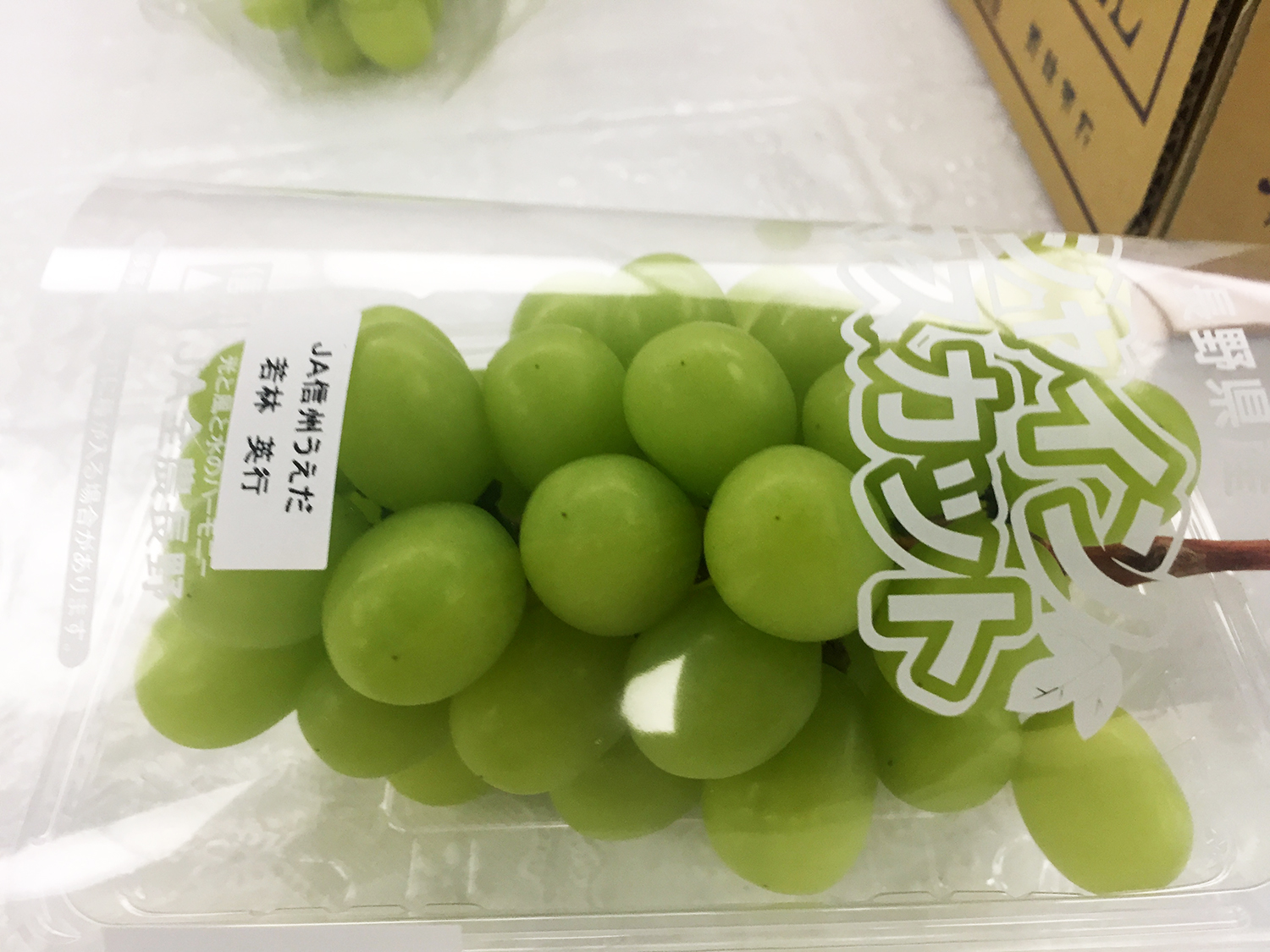 信州は上田の最高級シャインマスカット。緑色のブドウの中でも最高のもの。それも長野県産ブランドです。今の時期少し小さいですが味はのっています。
