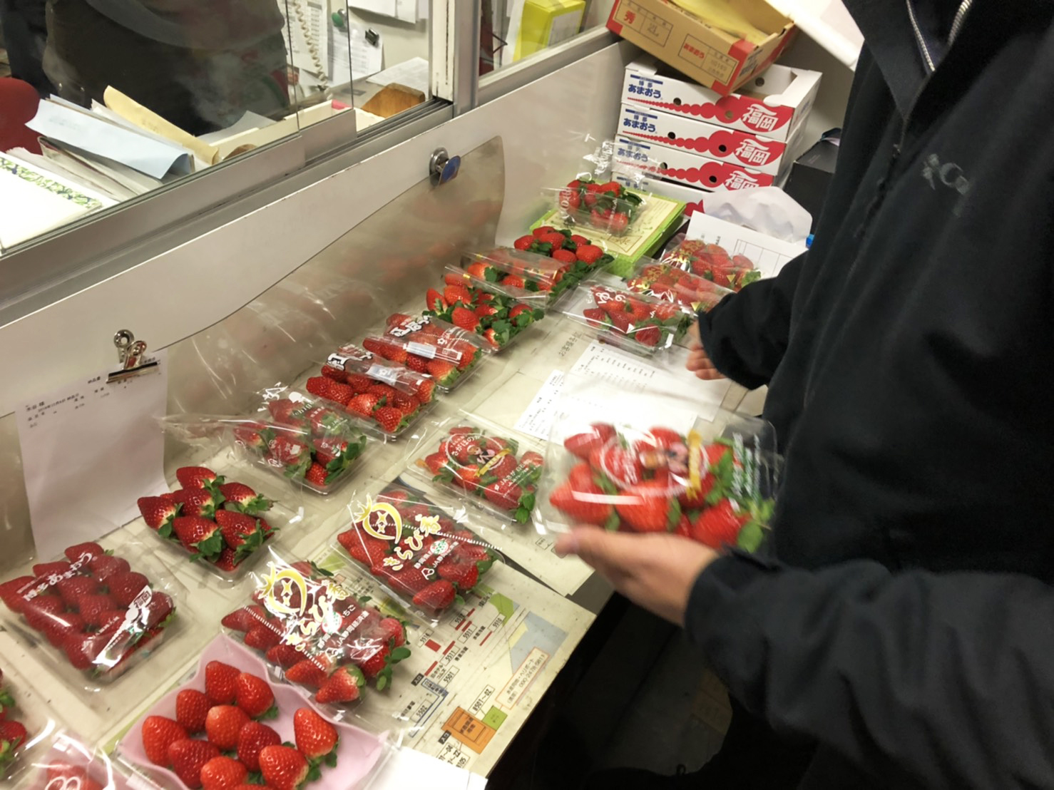 イチゴのせり場、仲卸がだいぶざわついてきている。